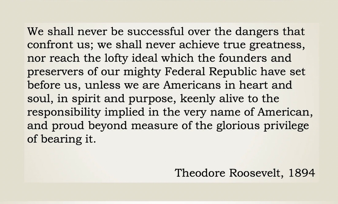 We shall never be successful over the dangers that confront us; we shall never achieve true greatness, nor reach the lofty ideal which the founders and preservers of our mighty Federal Republic have set before us, unless we are Americans in heart and soul, in spirit and purpose, keenly alive to the responsibility implied in the very name of American, and proud beyond measure of the glorious privilege of bearing it.