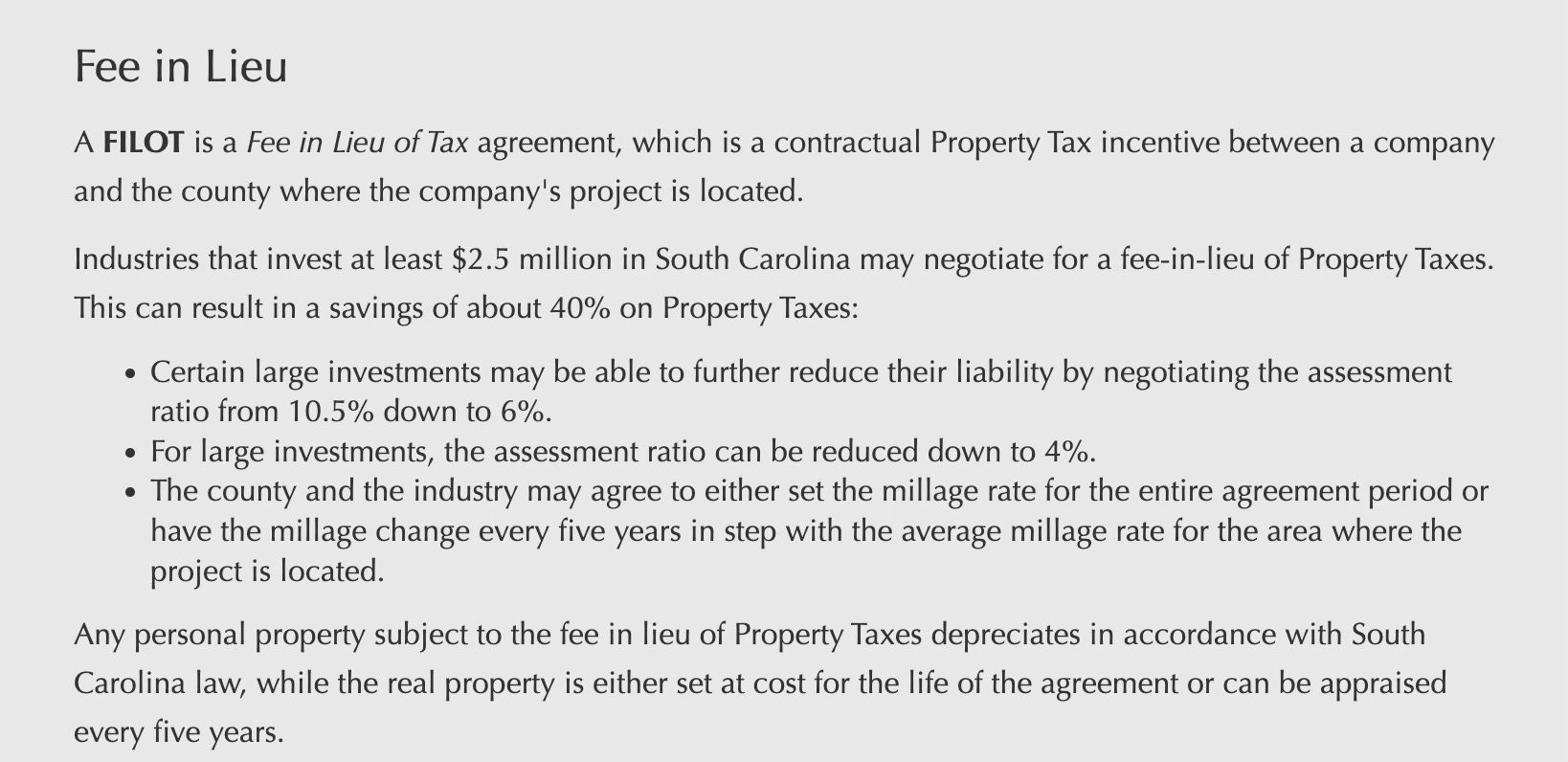 The South Carolina Department of Revenue website on Fee in Lieu of Tax agreements.