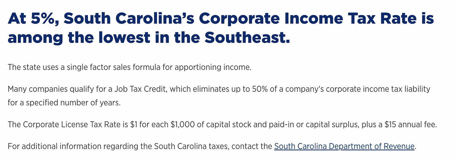 Here’s the icing on the cake: these corporations are only charged sales tax on the good that are sold within the borders of South Carolina. Any goods sold outside of South Carolina are exempt.