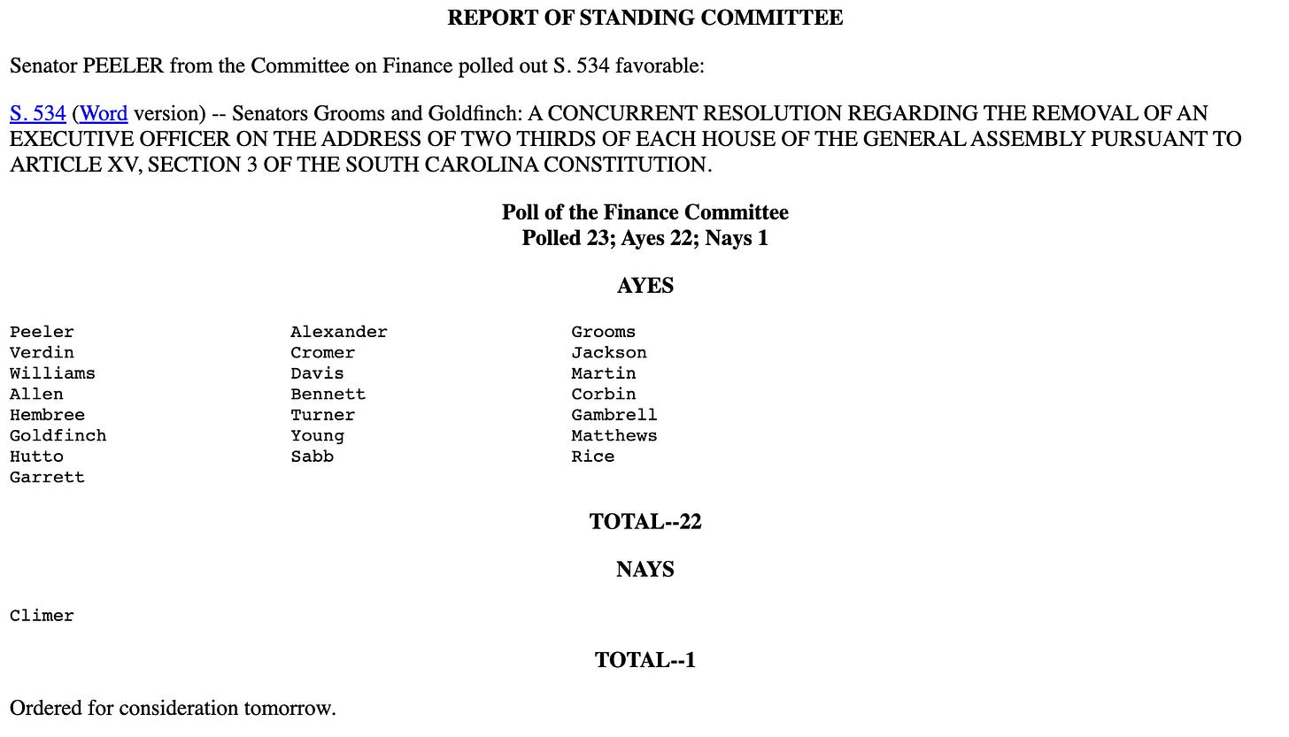 SC Senator Larry Grooms and Senator Stephen Goldfinch filed a bill (S.534) on April 2nd to remove South Carolina State Treasurer Curtis Loftis that is being fast-tracked through the Senate. On April 5th, it was polled out of the Senate Finance Committee with a favorable report of 22 Ayes and 1 Nay: