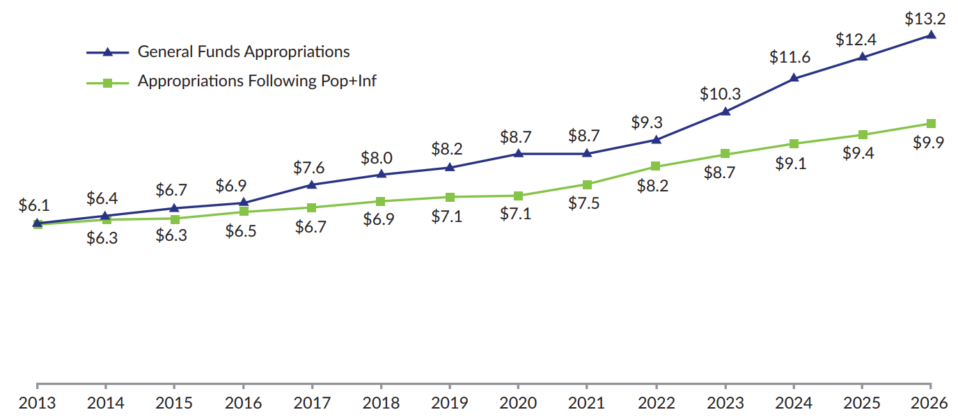 Despite these positive trends, fiscal policy has not kept pace with economic prudence. Figure 1 illustrates how General Fund appropriations have more than doubled since 2013—an increase of roughly 118 percent—while population growth plus inflation grew only 62 percent. The result is a structural imbalance: the government expanding faster than the average taxpayer’s ability to sustain it.
