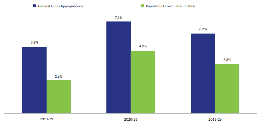 Figure 2 shows how General Fund spending has increased far faster than the combined growth of population and inflation over much of the last 14 years.